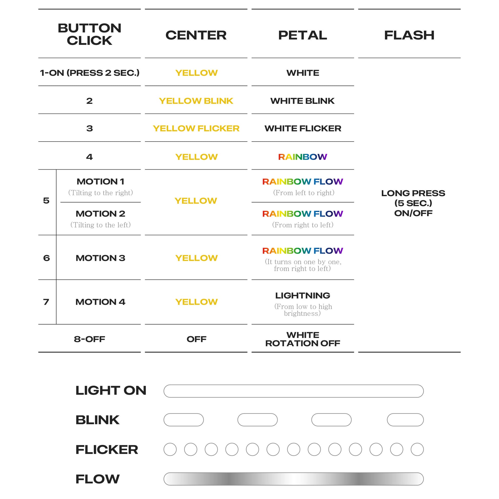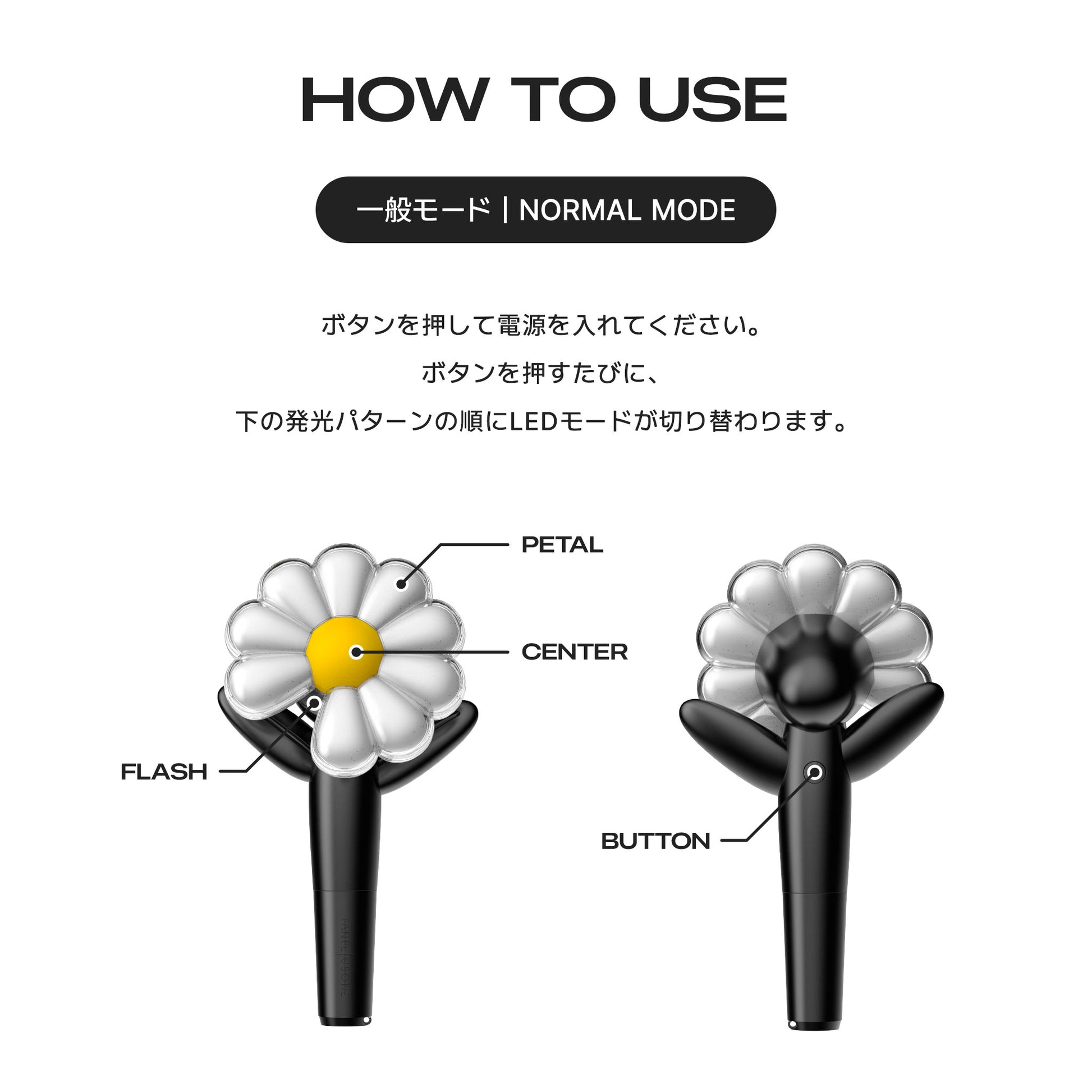 ②中央制御モード|CENTRAL CONTROL MODE 電池を入れ、公演会場に入場した後にボタンを押して、ペンライトのLEDが点灯した状態にしてください。 この状態でボタンを操作せずにしばらくお待ちいただくと、中央制御によって自動的に操作されます。